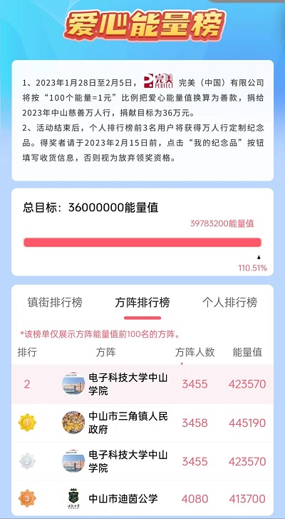 2023年中山慈善万人行的活动主题为“爱在中山 情暖人间”。为了进一步营造热烈氛围,中山慈善万人行总指挥部组织开发了线上万人行小程序,于2023年1月28日至2023年2月5日推出。校工会积极响应号召,组建了“yl6809永利检测中心中山学院”方队,动员了3455名师生员工参与2023年中山慈善万人行线上活动,积极参与爱心捐步和线上捐款,取得423570能量值,在全市所有方阵中排名第二。弘扬了人道博爱奉献精神,营造了互帮互助互爱的良好社会氛围。