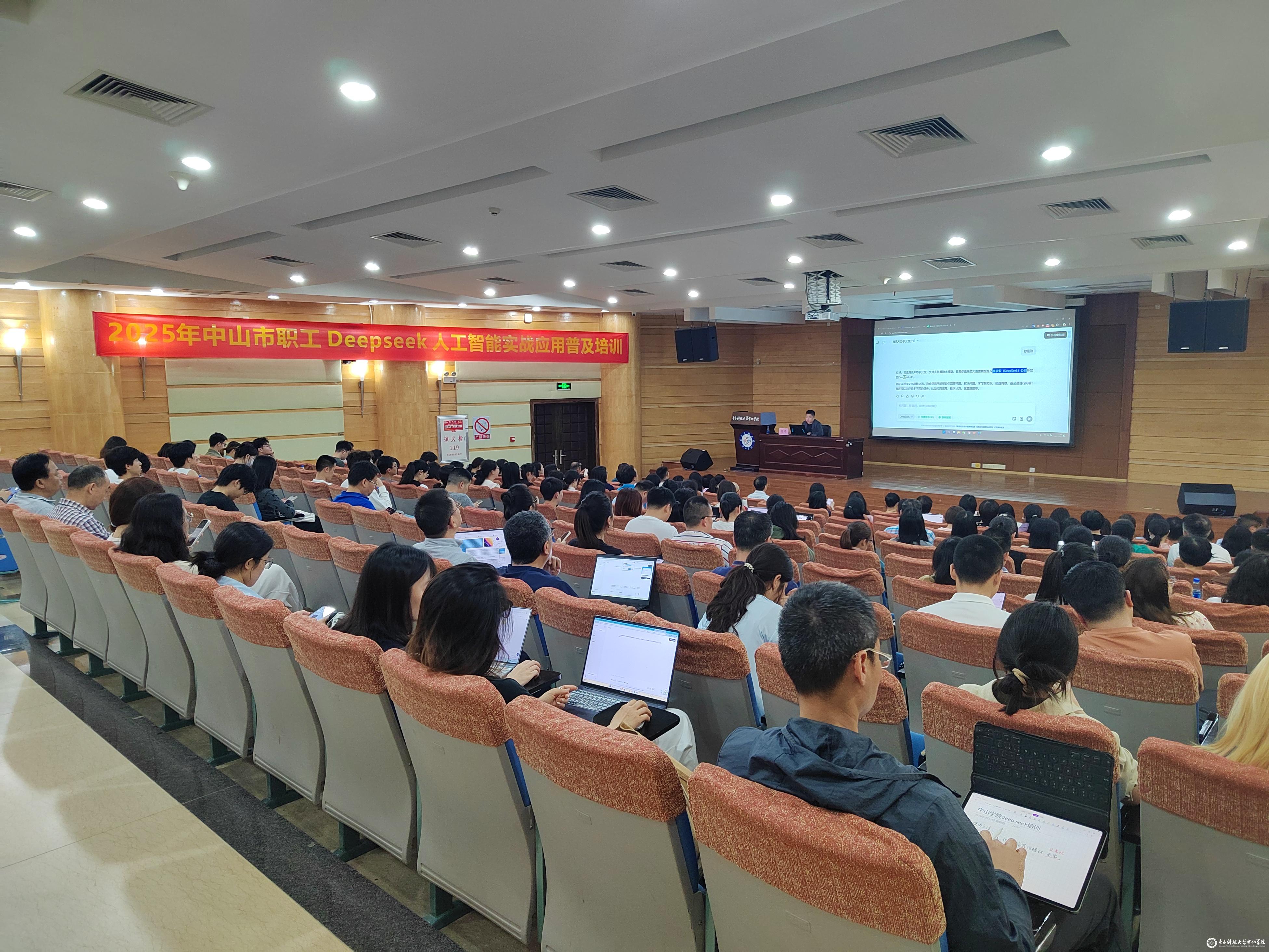 为加快人工智能技术在工作中的应用步伐,提高办公效率和业务能力,推动智能化工具在日常办公中的应用,按照中山市总工会文件精神,3月27日,校工会联合人事处在图书馆报告厅举办了“DeepSeek人工智能实战应用培训”。本次培训吸引了全校200余名师生员工参与,校党委书记袁正希、党委副书记叶立新出席了活动。